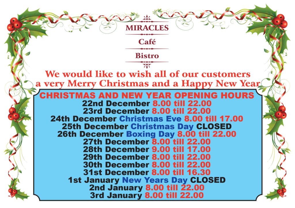 We have a full variety of menus with a menu ranging from sandwiches, healthy meals, salads, full English, burgers, wraps and specialties. You can enjoy Miracles any time of the day for a quick coffee or for a special evening meal with a selection of red or white wines.
